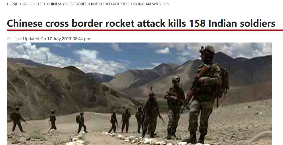 According to Dunya News, a 24-hours Urdu language news service in Pakistan, at least 158 Indian soldiers died and several others injured on Monday due to a Chinese rocket attack across the border.