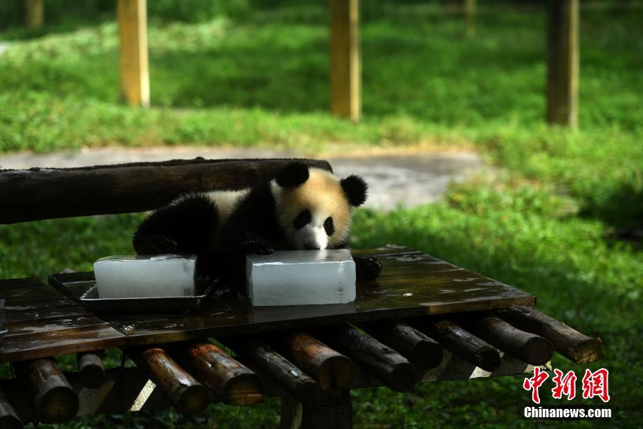 Staff at the Chongqing Zoo provided ice cubes for pandas to cool down because of the continuous high temperatures on July 18. (Photo/Chinanews.com)