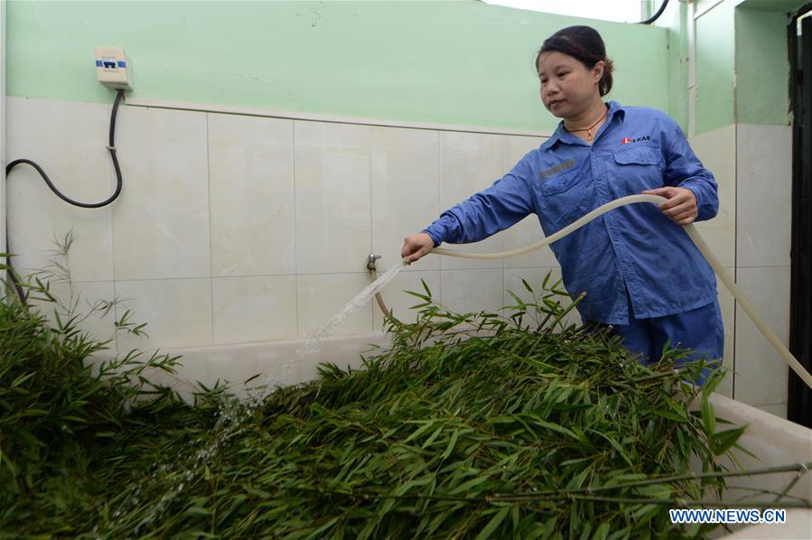 A staff worker washes fresh bamboo at the Nanchang Zoo in Nanchang, capital of east China's Jiangxi Province, July 17, 2017. (Xinhua/Peng Zhaozhi)