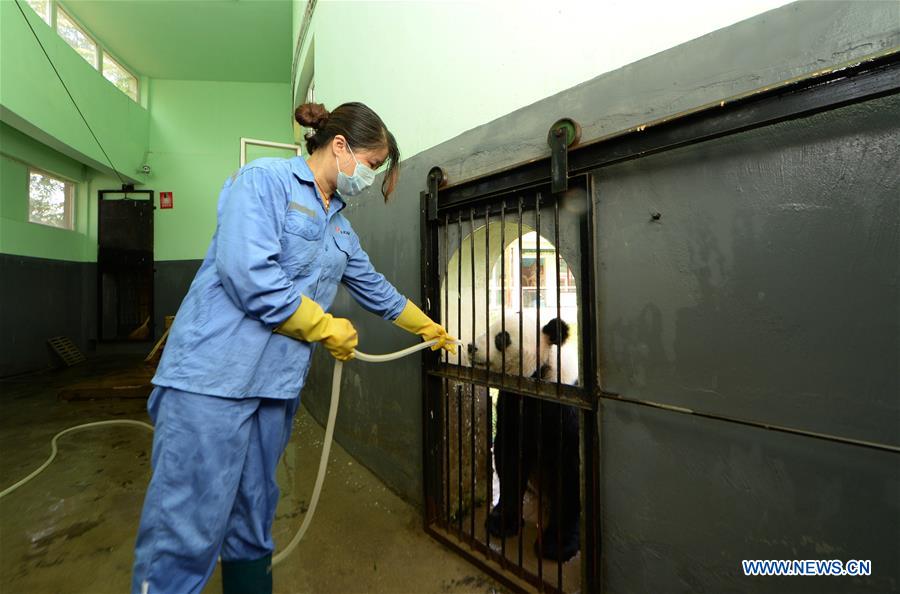 A staff worker bathes panda "Mei Ling" to cool it off at the Nanchang Zoo in Nanchang, capital of east China's Jiangxi Province, July 17, 2017. (Xinhua/Peng Zhaozhi)
