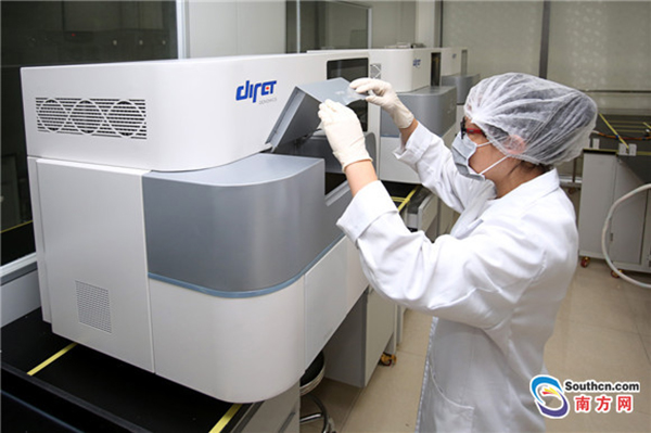 A researcher debugs a GenoCare sample third-generation single-molecule sequencer. (Nanfang Daily/Zhu Hongbo)