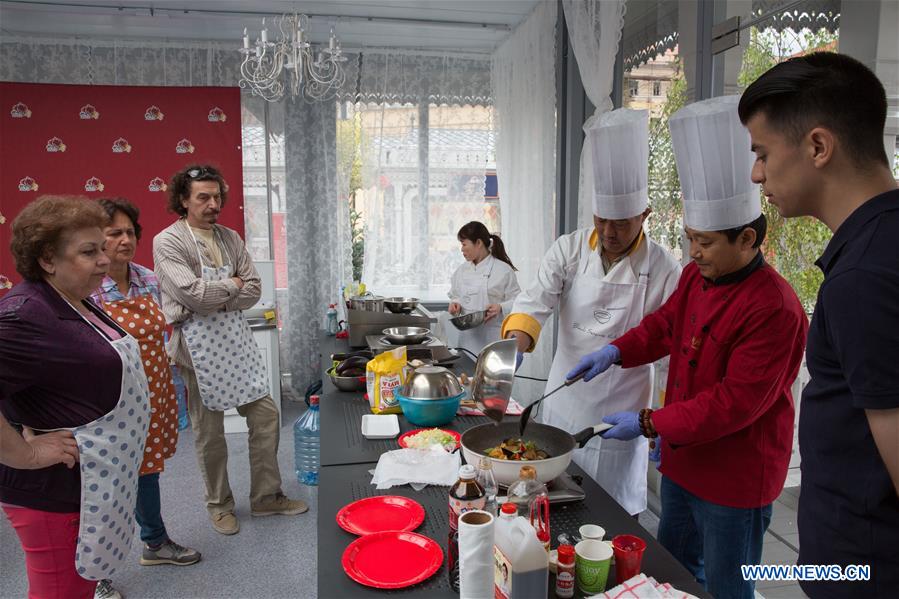 People look at how to make Chinese cuisine at the Chinese temple fair in Moscow, Russia, July 17, 2017. The 4-day Chinese temple fair opened here on July 15. (Xinhua/Bai Xueqi)