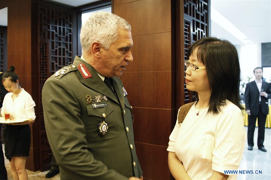 General Mikhail Kostarakos (L), Chairman of the European Union Military Committee, is interviewed with Xinhua at a reception celebrating the 90th anniversary of the founding of the People's Liberation Army of China in Brussels, Belgium, on July 19, 2017. General Mikhail Kostarakos, Chairman of the European Union Military Committee, congratulated the 90th anniversary of the founding of the People's Liberation Army of China at a reception co-hosted by the Chinese Mission to the EU and Chinese embassy in Belgium. (Xinhua/Han Chong)