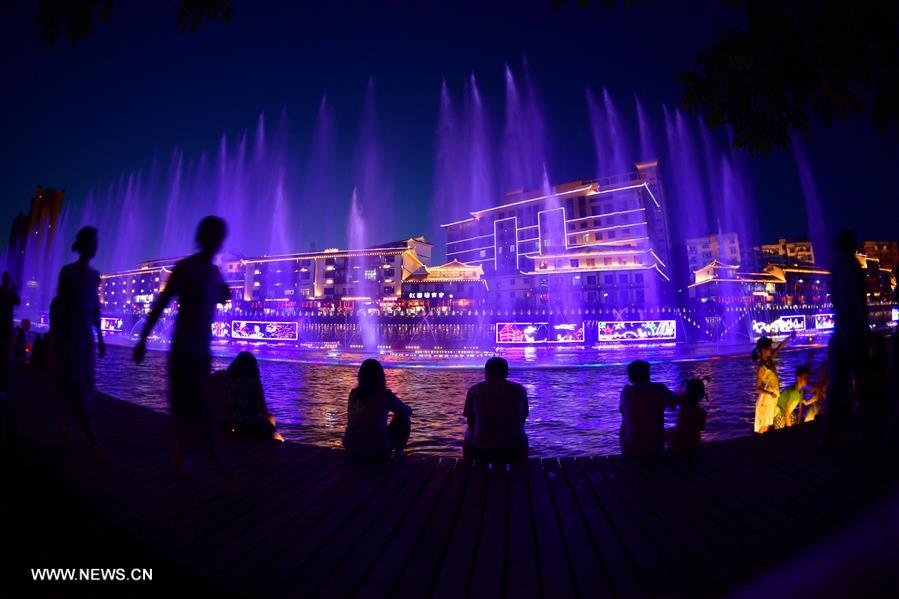 People enjoy coolness and the beautiful night view illuminated with colored lights along the Fengyu bridge at Xuanen County in Enshi Tujia and Miao Autonomous Prefecture, central China's Hubei Province, July 23, 2017. (Xinhua/Song Wen)