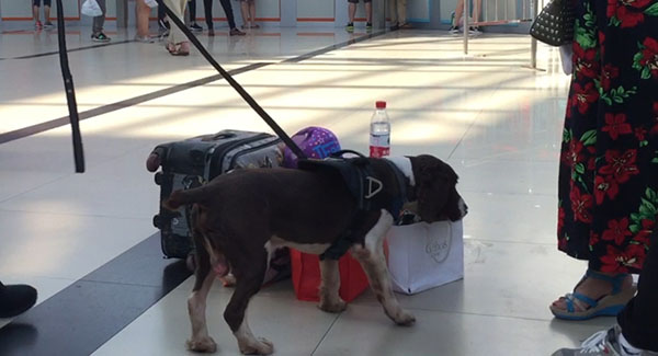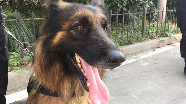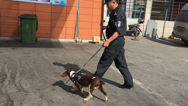 Outside the temperature is 39 degree Celsius. But four police dogs are on duty sniffing for hidden dangers at a long-distance bus station in Shanghai, where there are about 30,000 daily passengers and almost 50,000 visitors each day. The police dogs check 2,500 suitcases and bags in the waiting hall and boarding areas every day. If there is anything unusual, they will give a warning to the police.