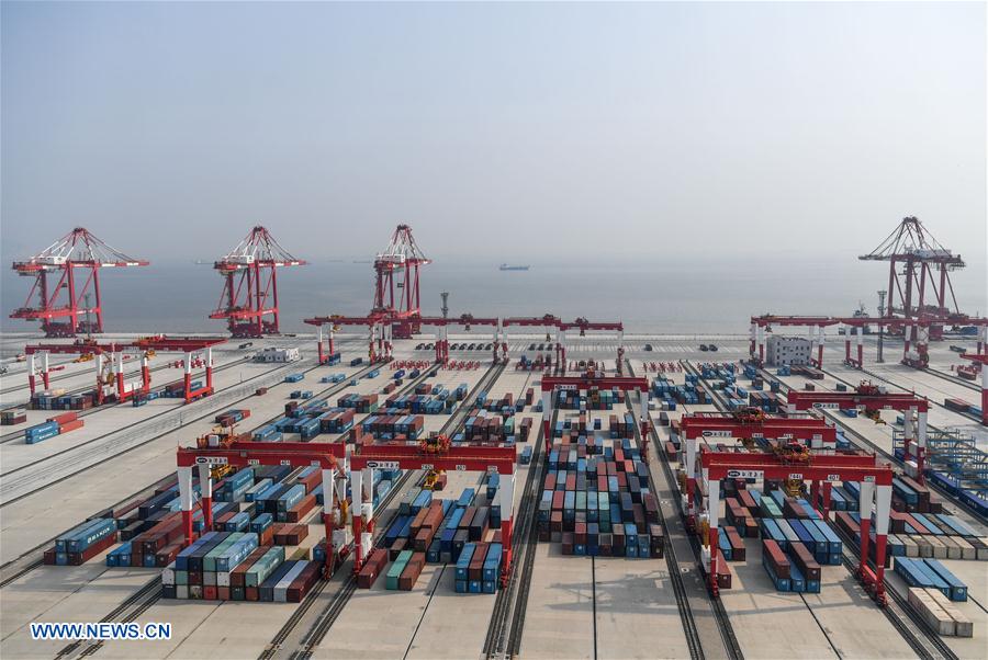 Photo taken on July 25, 2017 shows the fourth phase wharf of the Yangshan deep water port in Shanghai, east China. China's biggest automated cargo wharf, the fourth phase of the Yangshan deep water port, will start trial operation by the end of 2017. Upon completion of the project, the port will have seven deep-water berths and is expected to handle an annual throughput of four million TEUs (twenty-foot equivalent unit). (Xinhua/Shen Hong)