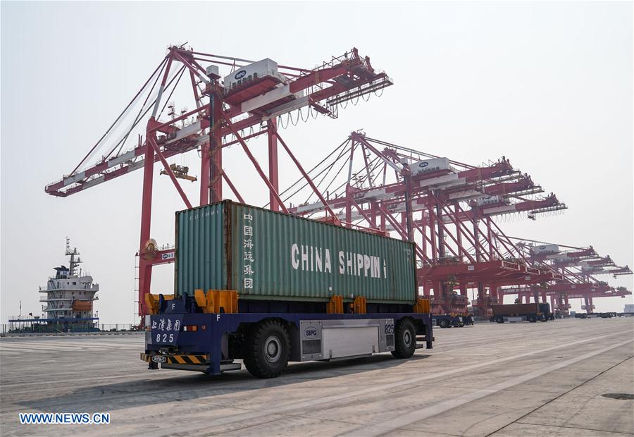 An automated guided vehicle moves on the wharf of the fourth phase of the Yangshan deep water port in Shanghai, east China, July 25, 2017. China's biggest automated cargo wharf, the fourth phase of the Yangshan deep water port, will start trial operation by the end of 2017. Upon completion of the project, the port will have seven deep-water berths and is expected to handle an annual throughput of four million TEUs (twenty-foot equivalent unit). (Xinhua/Shen Hong)