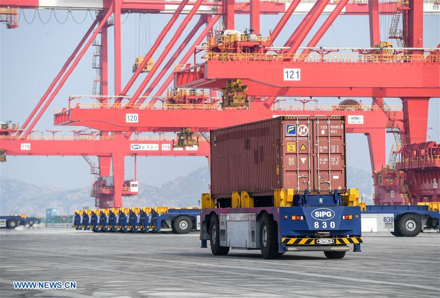 An automated guided vehicle moves on the wharf of the fourth phase of the Yangshan deep water port in Shanghai, east China, July 25, 2017. China's biggest automated cargo wharf, the fourth phase of the Yangshan deep water port, will start trial operation by the end of 2017. Upon completion of the project, the port will have seven deep-water berths and is expected to handle an annual throughput of four million TEUs (twenty-foot equivalent unit). (Xinhua/Shen Hong)