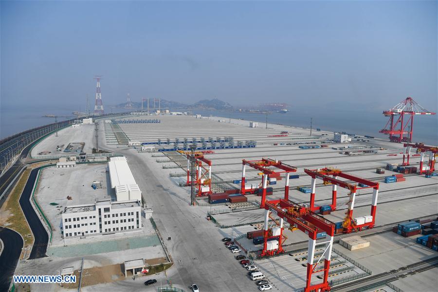 Photo taken on July 25, 2017 shows the construction site of the fourth phase of the Yangshan deep water port in Shanghai, east China. China's biggest automated cargo wharf, the fourth phase of the Yangshan deep water port, will start trial operation by the end of 2017. Upon completion of the project, the port will have seven deep-water berths and is expected to handle an annual throughput of four million TEUs (twenty-foot equivalent unit). (Xinhua/Shen Hong)