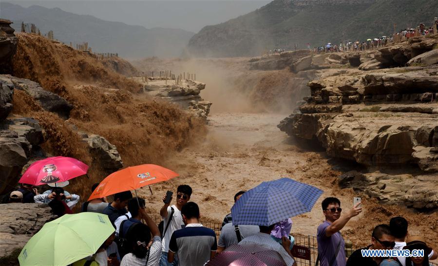 Tourists watch the Hukou Waterfalls on the Yellow River in Linfen, north China's Shanxi Province, July 26, 2017. The Hukou Waterfalls enter a summer flood period due to heavy rainfall in the upstream regions. (Xinhua/Lyu Guiming)