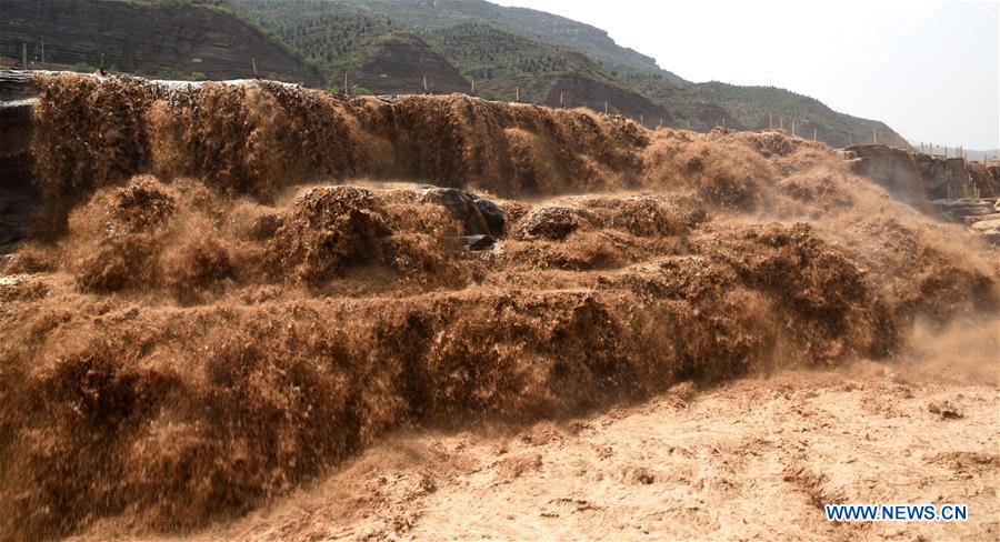 Hukou Waterfalls on the Yellow River is seen in this photo taken in Linfen, north China's Shanxi Province, July 26, 2017. The Hukou Waterfalls enter a summer flood period due to heavy rainfall in the upstream regions. (Xinhua/Lyu Guiming)