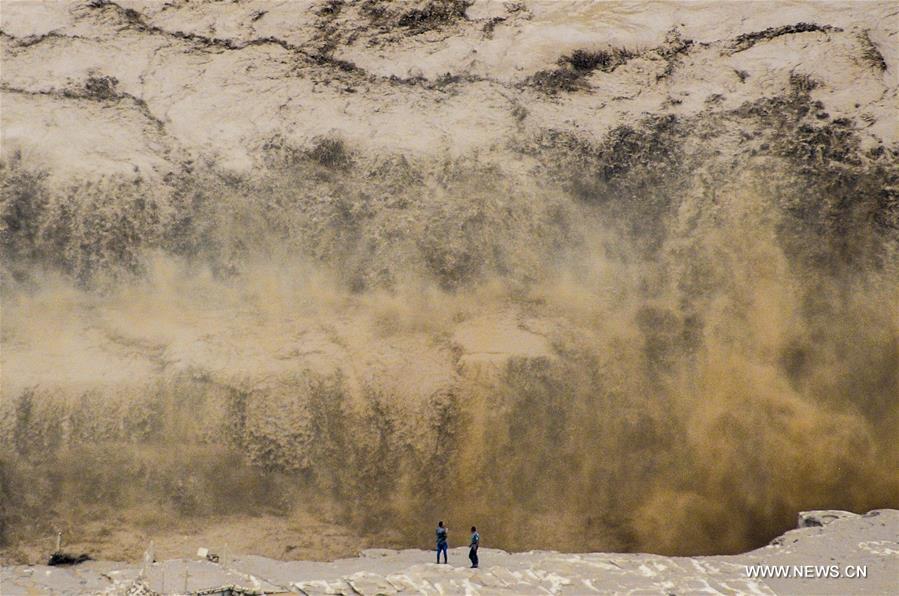 Photo taken on July 27, 2017 shows the Hukou Waterfall on the Yellow River on the border area between north China's Shanxi and northwest China's Shaanxi provinces. The annual maximum peak of Hukou Waterfall was seen on Thursday due to heavy rainfall. (Xinhua/Zhang Yunqiang)