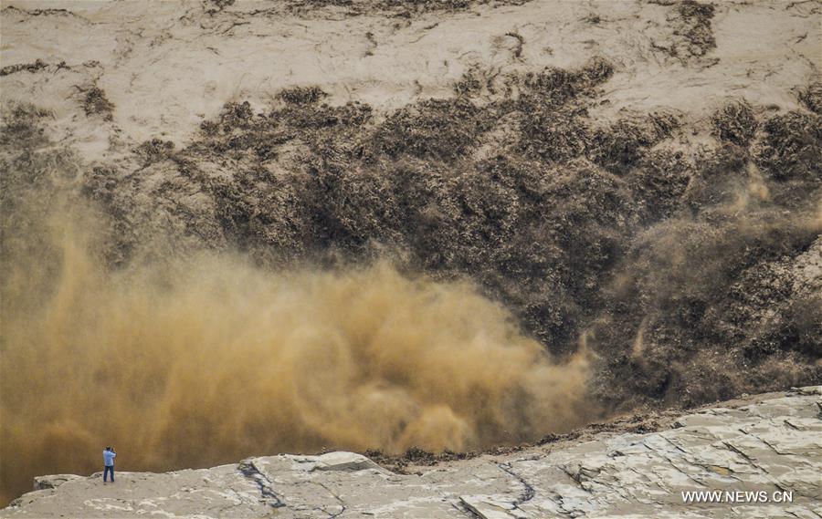 Photo taken on July 27, 2017 shows the Hukou Waterfall on the Yellow River on the border area between north China's Shanxi and northwest China's Shaanxi provinces. The annual maximum peak of Hukou Waterfall was seen on Thursday due to heavy rainfall. (Xinhua/Zhang Yunqiang)