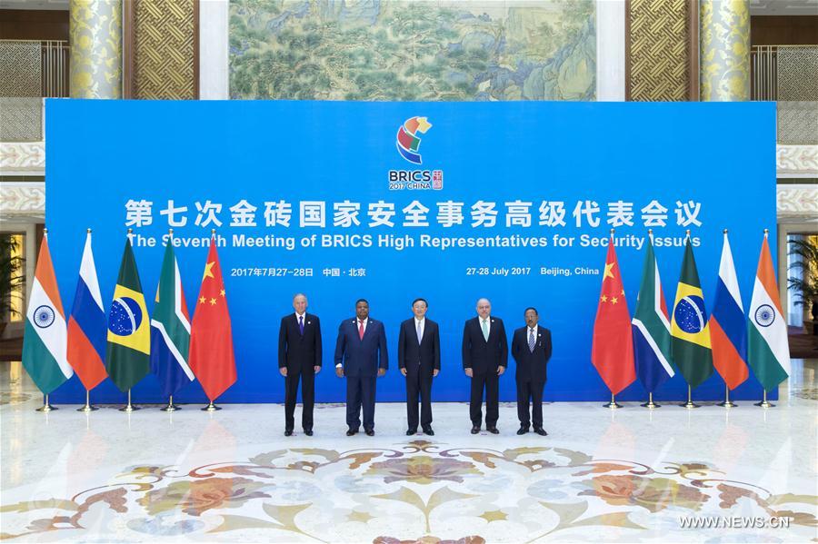 Chinese State Councilor Yang Jiechi, Russian Security Council Secretary Nikolai Patrushev, South African Minister of State Security David Mahlobo, Indian National Security Advisor Ajit Doval, and Brazilian Institutional Security Minister Sergio Etchegoyen attend the seventh meeting of BRICS High Representatives for Security Issues in Beijing, capital of China, July 28, 2017. (Xinhua/Cui Xinyu)