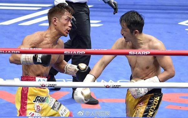 But the Chinese fighter dropped his hands throughout the fight and the 28-year-old Japanese underdog repeatedly piled forward for furious left-right combinations, despite suffering a heavily bleeding cut eye.