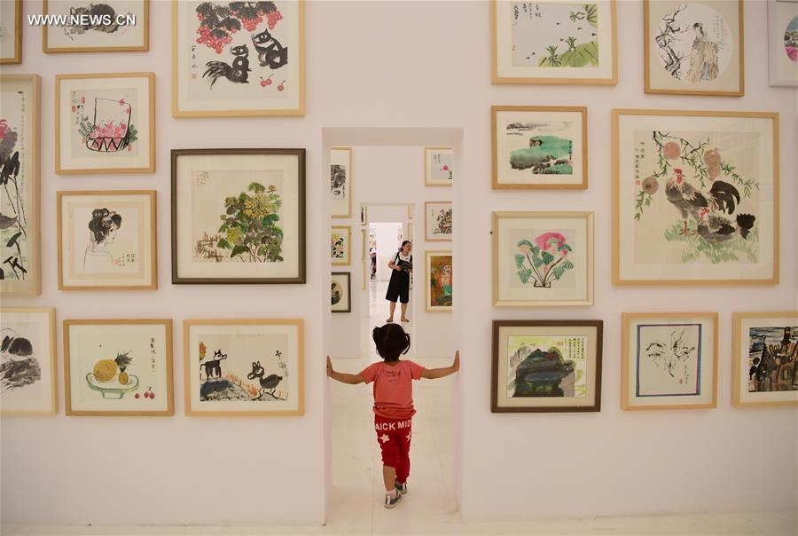 A child views pictures during a children's art exhibition in Xi'an, capital of northwest China's Shaanxi Province, July 29, 2017. More than 2,900 pieces of works were displayed on the exhibition. (Xinhua/Shao Rui)