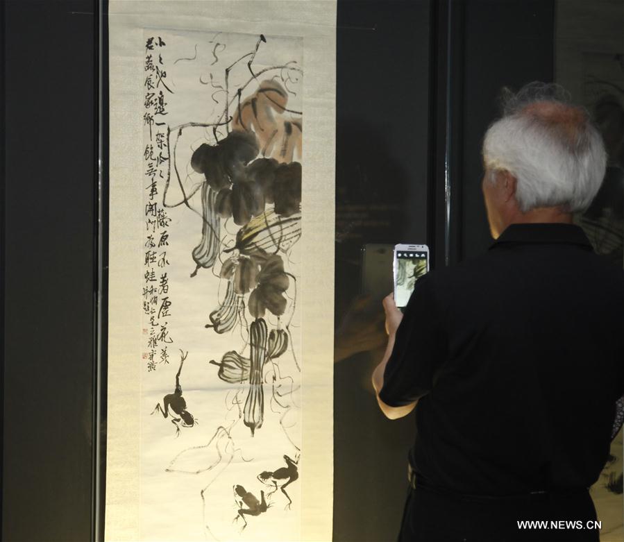 A visitor watches the artwork of Chinese artist Qi Baishi during an exhibition in Seoul, South Korea, on July 31, 2017. The artworks by Qi Baishi, which are collected by Hunan Provincial Museum, are exhibited in Seoul for the first time. (Xinhua/Yao Qilin)