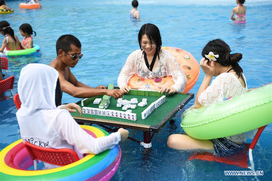 People play mahjong in a swimming pool to cool off at a waterpark in Chongqing, southwest China, Aug. 2, 2017. A red alert for high temperatures was issued by Chongqing meteorological observatory on Wednesday, as some areas saw temperatures surpass 40 degrees Celsius. (Xinhua/Wang Quanchao)