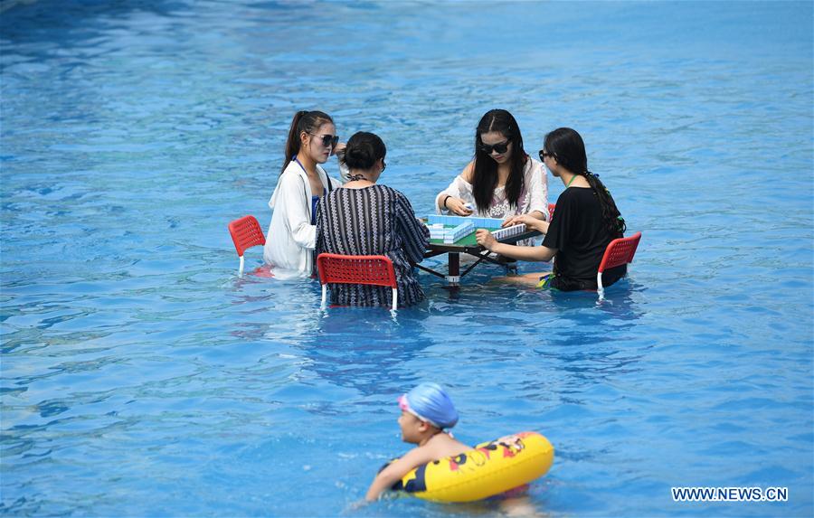 People play mahjong in a swimming pool to cool off at a waterpark in Chongqing, southwest China, Aug. 2, 2017. A red alert for high temperatures was issued by Chongqing meteorological observatory on Wednesday, as some areas saw temperatures surpass 40 degrees Celsius. (Xinhua/Wang Quanchao)