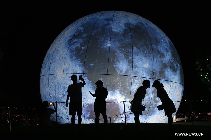 Visitors take photos in front of a huge moon light during a light show at Yunyang District of Shiyan City, central China's Hubei Province, Aug. 1, 2017. In this summer, people take different measures to beat the heat across China. (Xinhua/Cao Zhonghong)