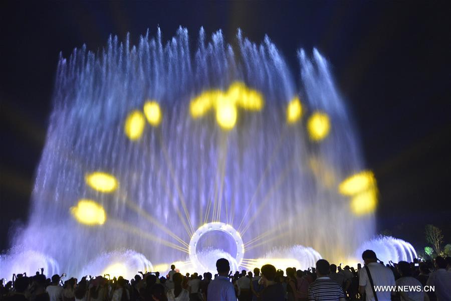 People enjoy coolness beside a musical fountain in Shibing County, southwest China's Guizhou Province, Aug. 1, 2017. In this summer, people take different measures to beat the heat across China. (Xinhua/Cai Xingwen)