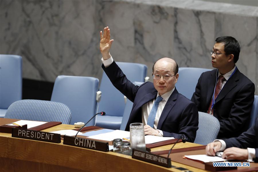 File photo taken on July 10, 2017 shows Liu Jieyi (Front), China's Permanent Representative to the United Nations and UN Security Council president for July, voting in favor of a Security Council resolution to establish a new UN mission to help reintegrate rebels from Colombia's former largest guerrilla group FARC back to society, at the UN headquarters in New York. China on July 31 concluded its rotating presidency of the UN Security Council for the month of July. Under the month-long Chinese presidency, the Security Council, which is the most powerful UN body, convened more than 30 meetings, adopted four resolutions and four presidential statements, and issued seven press statements. In July, China succeeded in holding two open debates on "enhancing African capacities in the areas of peace and security" and on the Mideast, namely the Israeli-Palestinian problem. The Security Council also discussed the issues of Syria, Yemen, South Sudan, Colombia, Libya, Cyprus and the Korean Peninsula. (Xinhua/Li Muzi)