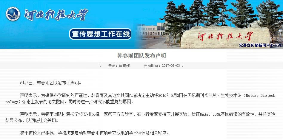 But the university he works at, the Hebei University of Science and Technology, said in a statement on Thursday that it has launched an investigation over Han's study.