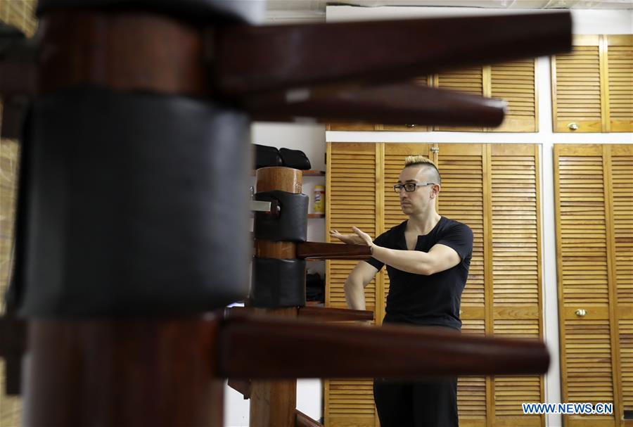 Alex Richter practices with the Wooden Dummy at his Kung Fu school "City Wing Tsun" in New York, the United States, July 12, 2017. Hidden in the midtown of bustling New York City is "City Wing Tsun". This is Alex Richter's Kung Fu school which features, as the name suggests, Wing Tsun, a Hong-Kong style martial art. As a native-born American kid, Richter was hugely influenced by the martial art films star Bruce Lee. His love towards Kung Fu, especially Wing Tsun, which Bruce Lee learned as a teenager, has been with him ever since. Richter started to learn Wing Tsun at the age of 15 in Seattle area in the United States. At age 19, Richter shipped himself to Germany for Wing Tsun training for several years. In 2002, he rented a small dance studio and started his career as a martial art instructor in New York. At the beginning, he had only 15 students. Step by step, he now has over 400 students. "Kung Fu is part of my life now, it influences the way you look at everything," he said. "It is not only about fist fighting." Richter has also improved his training curriculum to maximize the benefits for all students. He builds up records for all his students. Richter is also documenting the old stories of martial artists, hoping he can get them published in the future. (Xinhua/Wang Ying)