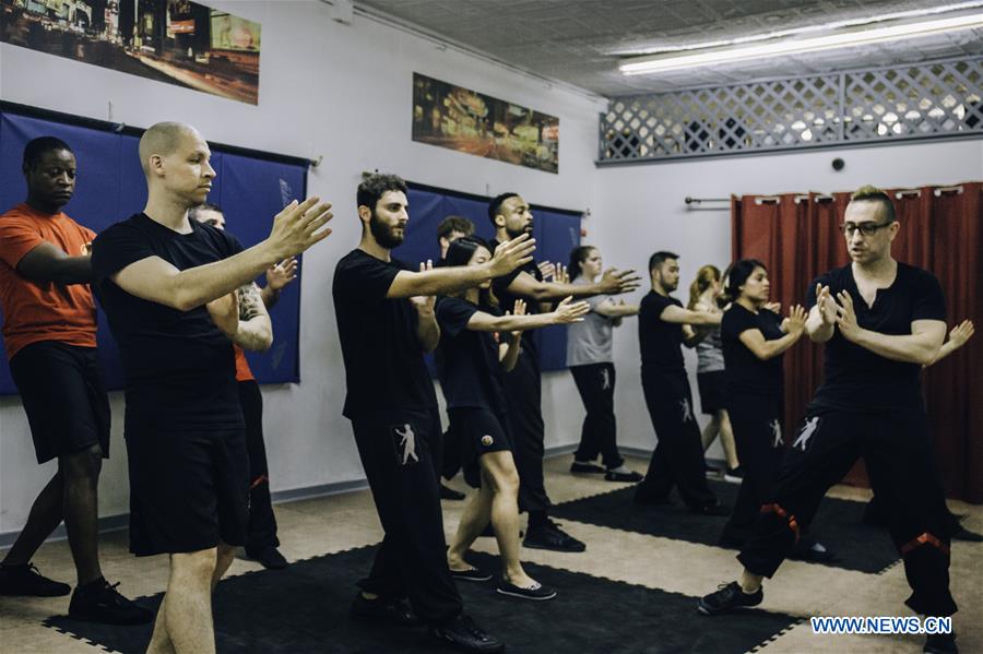 Alex Richter (1st R) gives lessons to his high-level students at his Kung Fu school "City Wing Tsun" in New York, the United States, July 12, 2017. Hidden in the midtown of bustling New York City is "City Wing Tsun". This is Alex Richter's Kung Fu school which features, as the name suggests, Wing Tsun, a Hong-Kong style martial art. As a native-born American kid, Richter was hugely influenced by the martial art films star Bruce Lee. His love towards Kung Fu, especially Wing Tsun, which Bruce Lee learned as a teenager, has been with him ever since. Richter started to learn Wing Tsun at the age of 15 in Seattle area in the United States. At age 19, Richter shipped himself to Germany for Wing Tsun training for several years. In 2002, he rented a small dance studio and started his career as a martial art instructor in New York. At the beginning, he had only 15 students. Step by step, he now has over 400 students. "Kung Fu is part of my life now, it influences the way you look at everything," he said. "It is not only about fist fighting." Richter has also improved his training curriculum to maximize the benefits for all students. He builds up records for all his students. Richter is also documenting the old stories of martial artists, hoping he can get them published in the future. (Xinhua/Xu Keshuang)