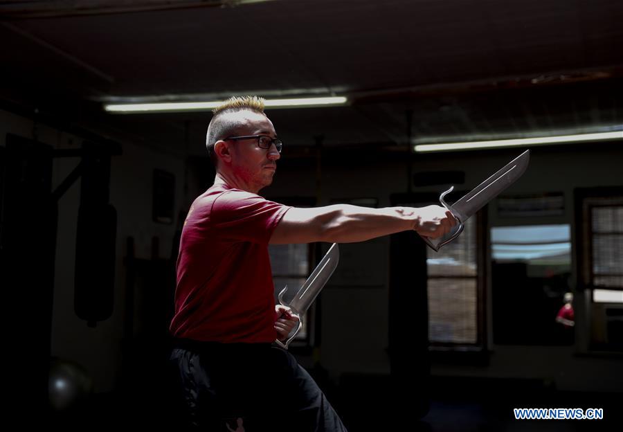 Alex Richter shows the Butterfly Swords Form in Wing Tsun at his Kung Fu school "City Wing Tsun" in New York, the United States, July 17, 2017. Hidden in the midtown of bustling New York City is "City Wing Tsun". This is Alex Richter's Kung Fu school which features, as the name suggests, Wing Tsun, a Hong-Kong style martial art. As a native-born American kid, Richter was hugely influenced by the martial art films star Bruce Lee. His love towards Kung Fu, especially Wing Tsun, which Bruce Lee learned as a teenager, has been with him ever since. Richter started to learn Wing Tsun at the age of 15 in Seattle area in the United States. At age 19, Richter shipped himself to Germany for Wing Tsun training for several years. In 2002, he rented a small dance studio and started his career as a martial art instructor in New York. At the beginning, he had only 15 students. Step by step, he now has over 400 students. "Kung Fu is part of my life now, it influences the way you look at everything," he said. "It is not only about fist fighting." Richter has also improved his training curriculum to maximize the benefits for all students. He builds up records for all his students. Richter is also documenting the old stories of martial artists, hoping he can get them published in the future. (Xinhua/Wang Ying)