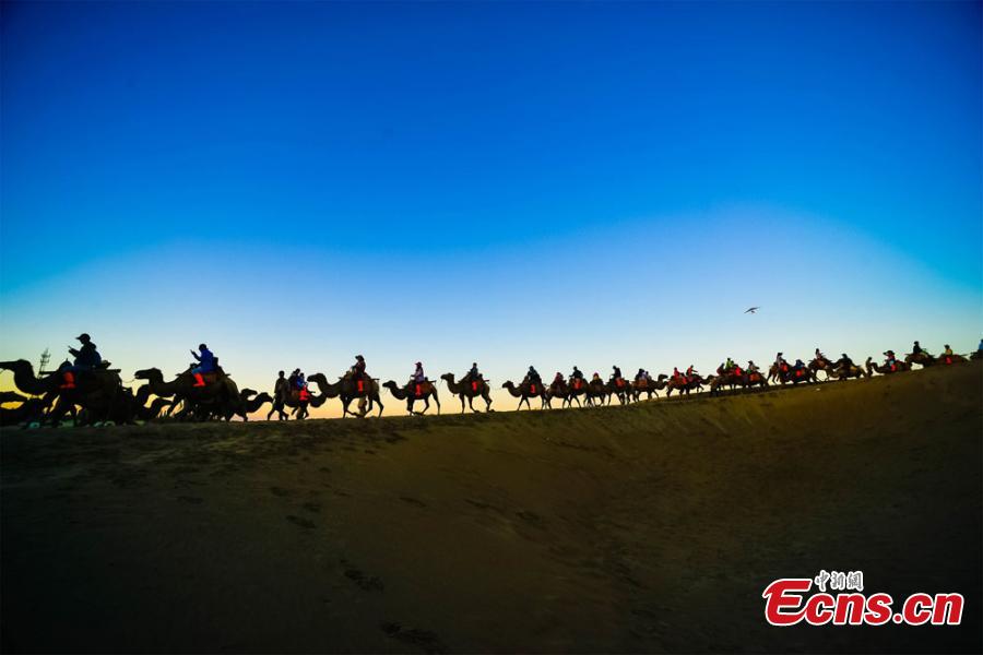 Tourists ride camels at the Crescent Spring and Singing-Sand Dunes scenic spot in Dunhuang City, Northwest China’s Gansu Province. More than 25,000 people visit the tourist attraction each day during the peak summer period. (Photo: China News Service/Wang Binyin)