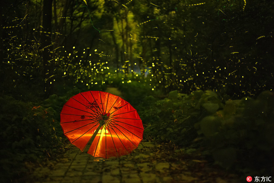 Photos taken on July 17, 2017 show fireflies gathering around a red paper umbrella, lighting up a beautiful summer night at a village in Nanjing, east China's Jiangsu Province. Thanks to recent improvements in the local ecology, fireflies, which hadn't been seen for years, have begun appearing again in the village. [Photo: IC]