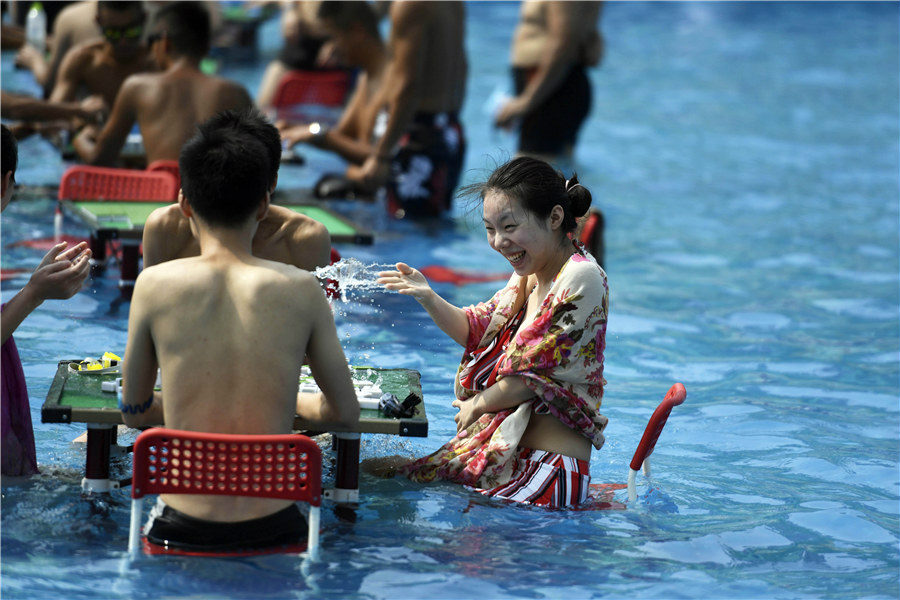 People have fun playing mahjong in a swimming pool in Southwest China's Chongqing, August 2, 2017. [Photo by Ran Wen/Asianewsphoto]