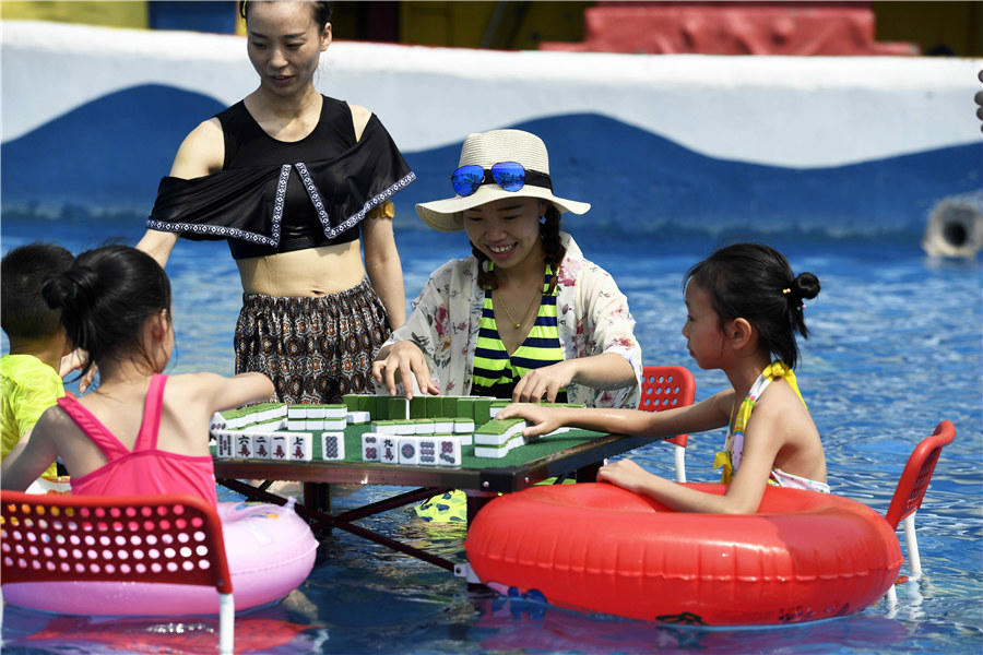 People have fun playing mahjong in a swimming pool in Southwest China's Chongqing, August 2, 2017. [Photo by Ran Wen/Asianewsphoto]