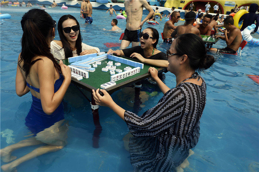 Four women have fun playing mahjong in a swimming pool to beat heat, in Southwest China's Chongqing, August 2, 2017. A red alert for high temperature was issued on Wednesday in Chongqing. [Photo by Ran Wen /Asianewsphoto]