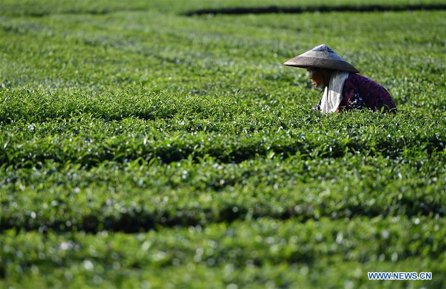 A farmer picks tea leaves in the tea garden of Xuanen County, Enshi Tujia Autonomous Prefecture, central China's Hubei Province, Aug. 7, 2017. Monday marks the Beginning of Autumn, one of the 24 Solar Terms. The local farmers begin their new session of seasonal tea production, the major source of income. (Xinhua/Song Wen)