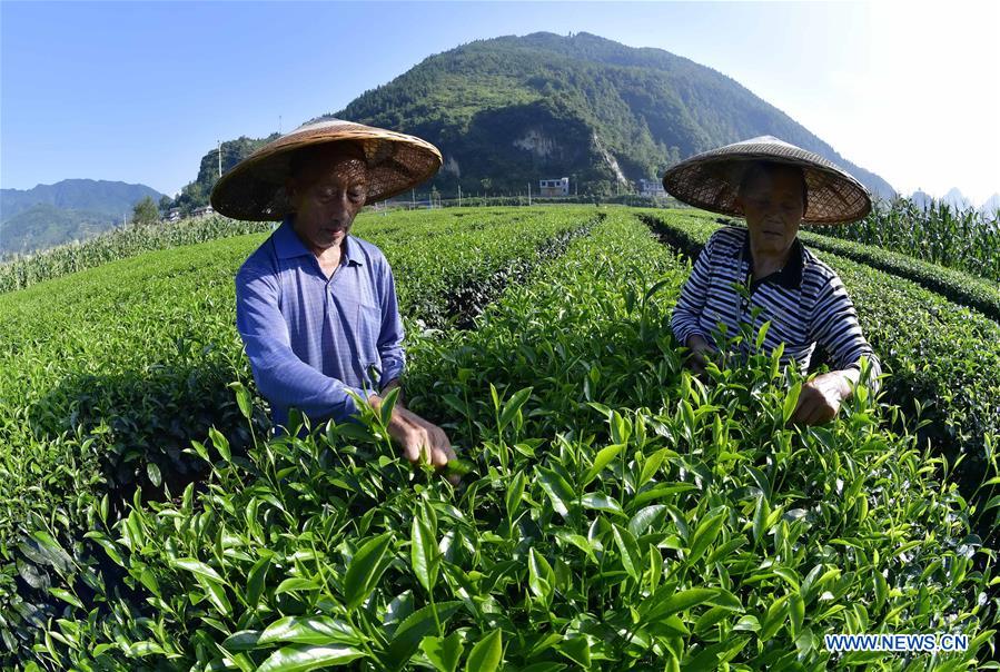 Farmers pick tea leaves in the tea garden of Xuanen County, Enshi Tujia Autonomous Prefecture, central China's Hubei Province, Aug. 7, 2017. Monday marks the Beginning of Autumn, one of the 24 Solar Terms. The local farmers begin their new session of seasonal tea production, the major source of income. (Xinhua/Song Wen)
