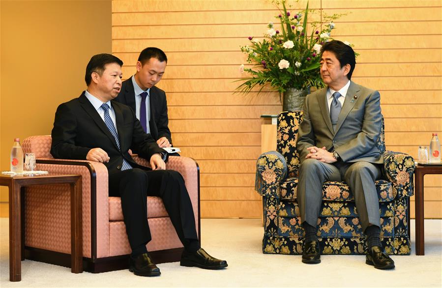 Japanese Prime Minister and Liberal Democratic Party President Shinzo Abe meets with Song Tao (L), head of the International Department of the Communist Party of China Central Committee in Tokyo, Japan, Aug. 8, 2017. (Xinhua/Hua Yi)