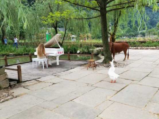 A video from International Piano Art Week section of the event shows the cow standing close to a visiting piano player under the trees, listening attentively to the music.