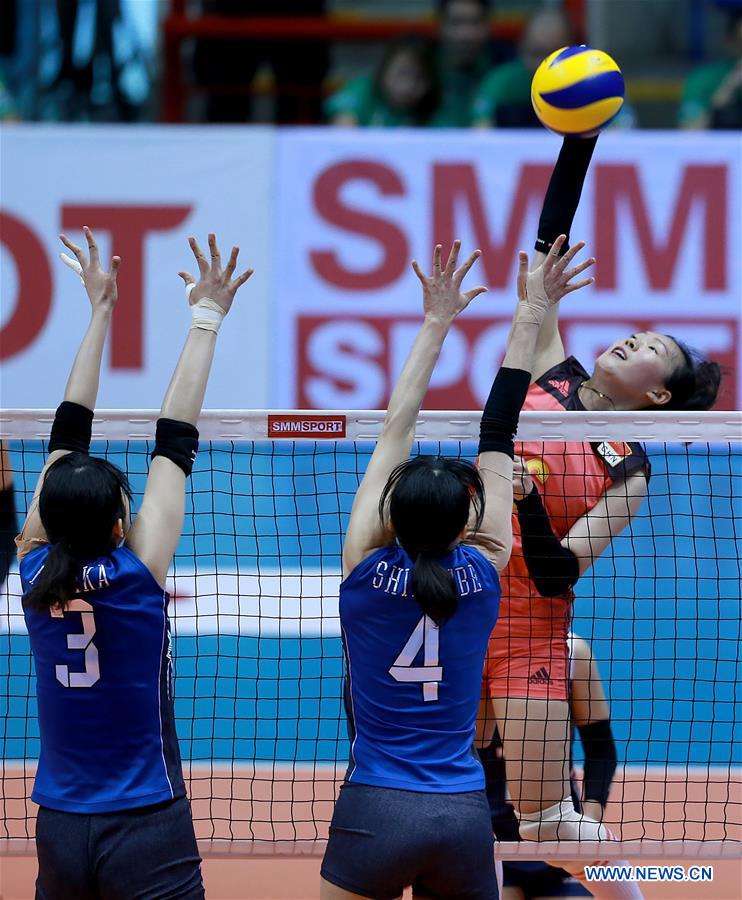 Cai Xiao Qing of China (R) competes against Nana Iwasaka (L) and Risa Shinnabe (C) of Japan during their preliminary round match in the 2017 Asian Women's Volleyball Championship in Laguna Province, the Philippines, Aug. 10, 2017. Japan won 3-0. (Xinhua/Rouelle Umali)