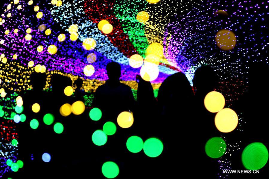 Tourists are silhouetted against the light that illuminates a park in Gu'an County of north China's Hebei Province Aug. 10, 2017. The county is hosting a light festival to attract tourists. (Xinhua/Wang Xiao)