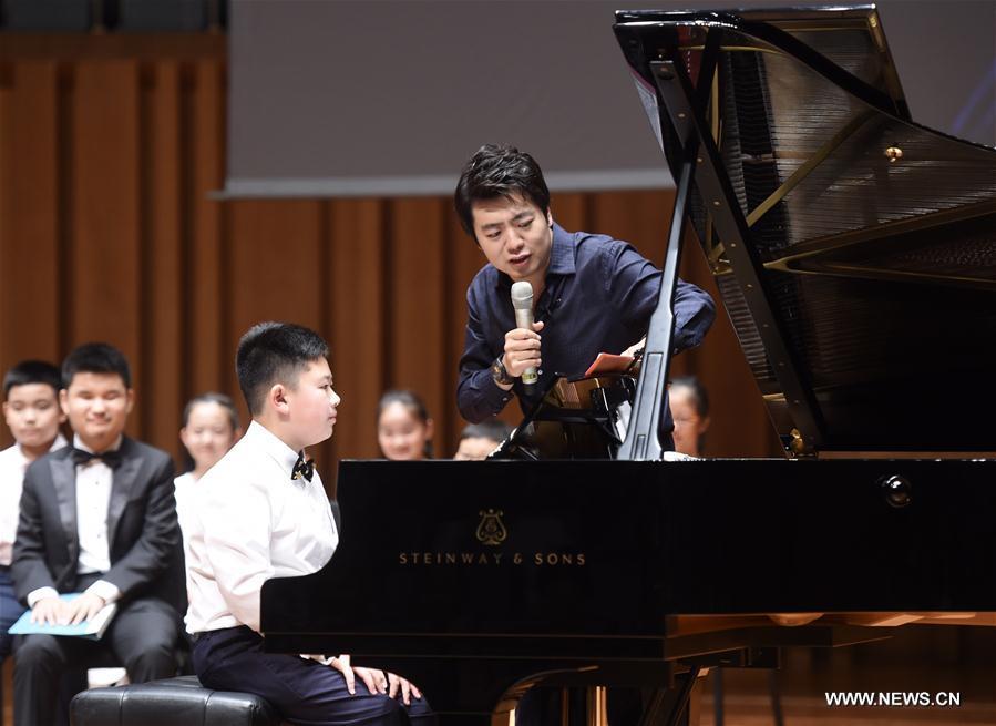 Pianist Lang Lang instructs a child at National Center for the Performing Arts (NCPA) in Beijing, capital of China, Aug. 14, 2017. As the season's Artist-in-Residence, Lang Lang shared his story and piano skills with children at an educational session in the NCPA on Monday. (Xinhua/Luo Xiaoguang)