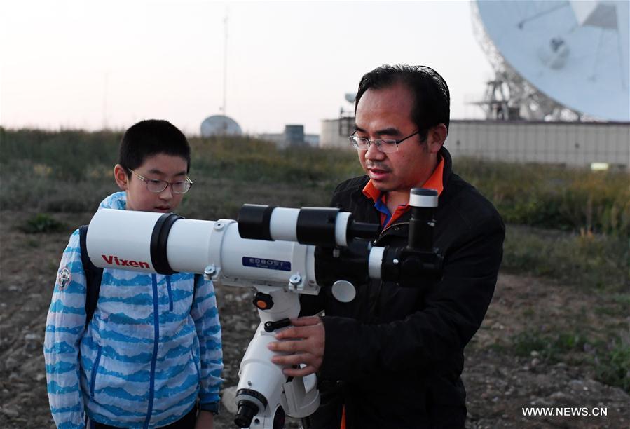 Song Huagang, secretary general of Xinjiang Astronomical Society, explains as a young observer looks on at Nanshan observation station of Xinjiang Observatory in Urumqi, capital of northwest China's Xinjiang Uygur Autonomous Region, Aug. 13, 2017. Young amateurs gathered to observe the Perseid meteor shower at the observation station which serves as a national science education base. (Xinhua/Wang Fei)