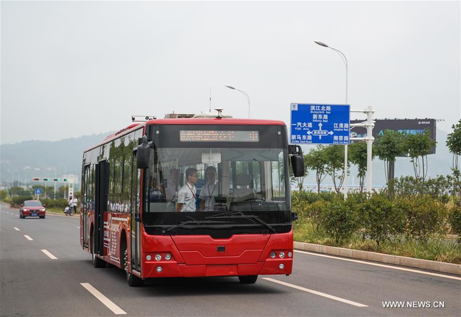 Photo taken on Aug. 15, 2017 shows a 12-meter-long electric smart bus running on the road during a road test in Zhuzhou, central China's Hunan Province. Chinese rail maker CRRC announced it has developed a 12-meter-long electric smart bus on July 18, with a top speed of 40 kilometers per hour. (Xinhua/Shen Hong)