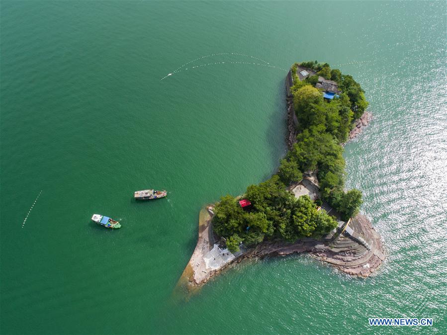 Workers clean the surface of the Qiandaohu Lake in Chun'an County of east China's Zhejiang Province Aug. 16, 2017. The lake, a famous scenic spot, is under stricter protection now as the local government issued a zero emission policy according to which garbage disposal, residents' waste water and vehicle emission are under tighter control. (Xinhua/Xu Yu)