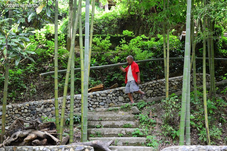Yang Mingquan, 68, carries bamboo in Fanzhao Village of Nanshao Town in Jianhe County, southwest China's Guizhou Province, Aug. 18, 2017. The brothers, makers of the bamboo raft for several decades, saw its vanish years ago as the new transportation took the lead in the daily life, but they are demanded now to revive the old crafts. In recent years, local tourism industry booms with more tourists curious about the traditional local life including the rafting as the old fashioned transport. (Xinhua/Yang Wenbin)