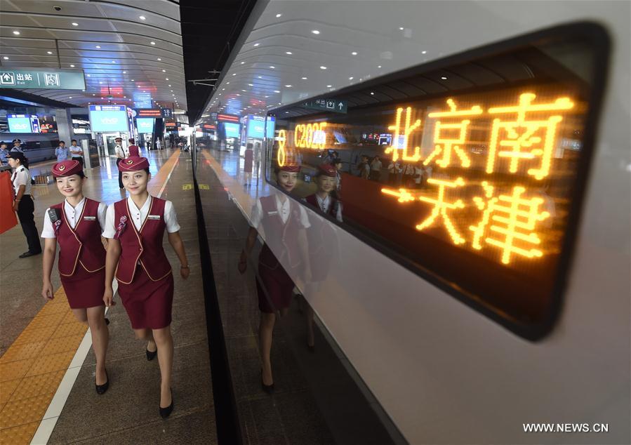Conductors walk past the Fuxing train at the Beijing South Railway Station in Beijing, capital of China, Aug. 21, 2017. China's new-generation bullet trains, the Fuxing, was put into operation on the Beijing-Tianjin Intercity Railway Aug. 21. (Xinhua/Luo Xiaoguang)