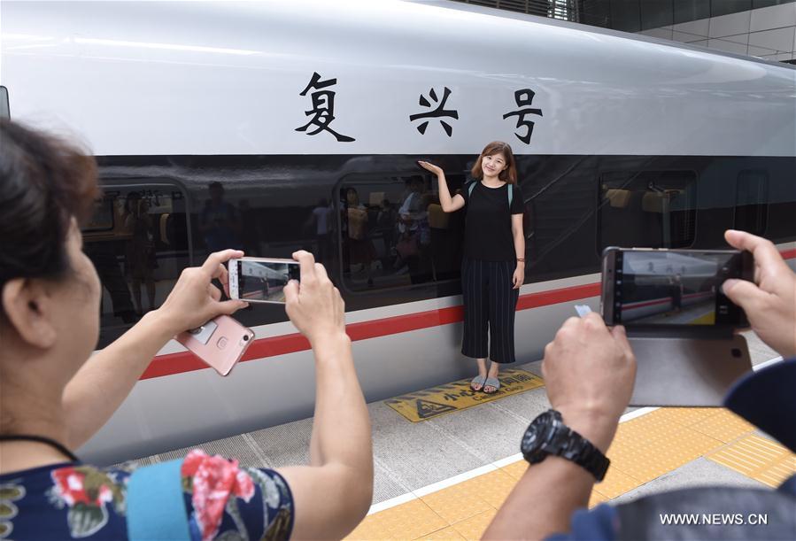 Passengers take photos in front of the Fuxing train at the Tianjin Railway Station in Tianjin, north China, Aug. 21, 2017. China's new-generation bullet trains, the Fuxing, was put into operation on the Beijing-Tianjin Intercity Railway Aug. 21. (Xinhua/Luo Xiaoguang)