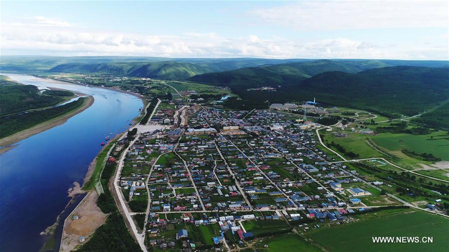 Photo taken on Aug. 10, 2017 shows the construction site of a road bridge over the Heilongjiang River at the border of China and Russia. The bridge is over 200 kilometers away from Huma County. The road bridge linking Heihe of northeast China's Heilongjiang Province and the Russian city of Blagoveshchensk is scheduled to open to traffic in 2019. (Xinhua/Wang Song)