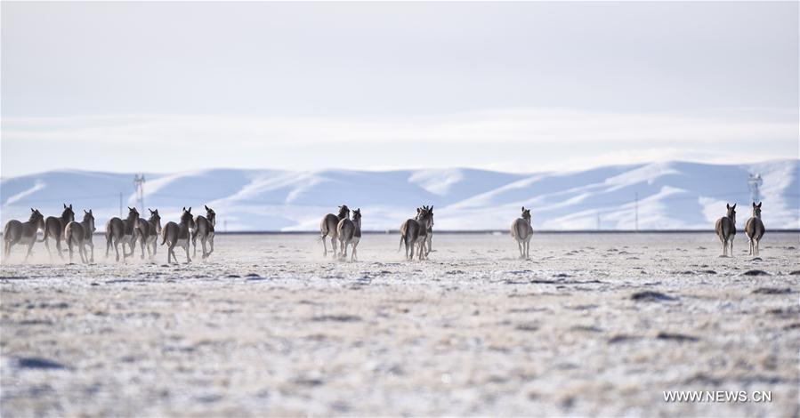 Kiangs run in Hoh Xil in Yushu Tibetan Autonomous Prefecture, northwest China's Qinghai Province, Dec. 2, 2016. Hol Xil has an average altitude of over 4,600 meters, making it an ideal habitat for Tibetan antelopes, kiangs and other animals. It was enlisted as one of the UNESCO's World Natural Heritages in July 2017. (Xinhua/Wu Gang)